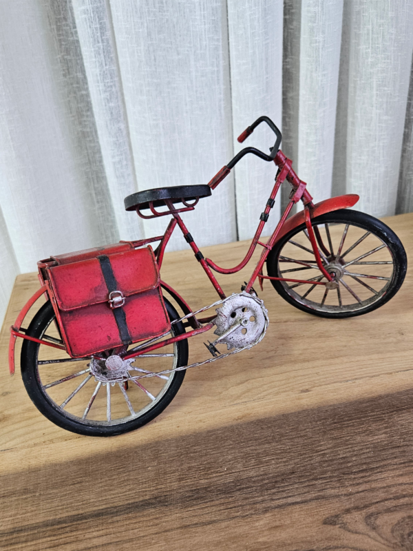 Esta charmosa bicicleta de metal é uma peça decorativa única, pintada à mão com um acabamento vermelho vibrante. Os detalhes intrincados, incluindo os raios das rodas e a pequena mala, adicionam um toque de nostalgia e charme. Seu design compacto a torna ideal para exibição em prateleiras, mesas ou como parte de uma coleção.