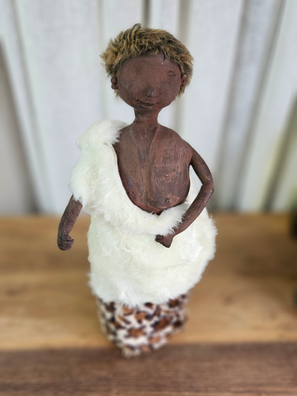 Esta boneca de barro negra é uma obra-prima artesanal que celebra a beleza e a força da cultura. Com suas feições delicadas e expressivas, ela carrega a essência de histórias ancestrais, refletindo a rica herança que molda sua identidade.